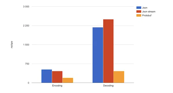 Mình sẽ viết chi tiết về Protobuf (và hướng dẫn sử dụng nó với Golang) trong một bài khác, trong khuôn khổ bài này mình chỉ muốn giới thiệu gRPC thôi cho gọn. Nhưng về tốc độ encode/decode các bạn có thể xem qua một benchmark dưới đây: